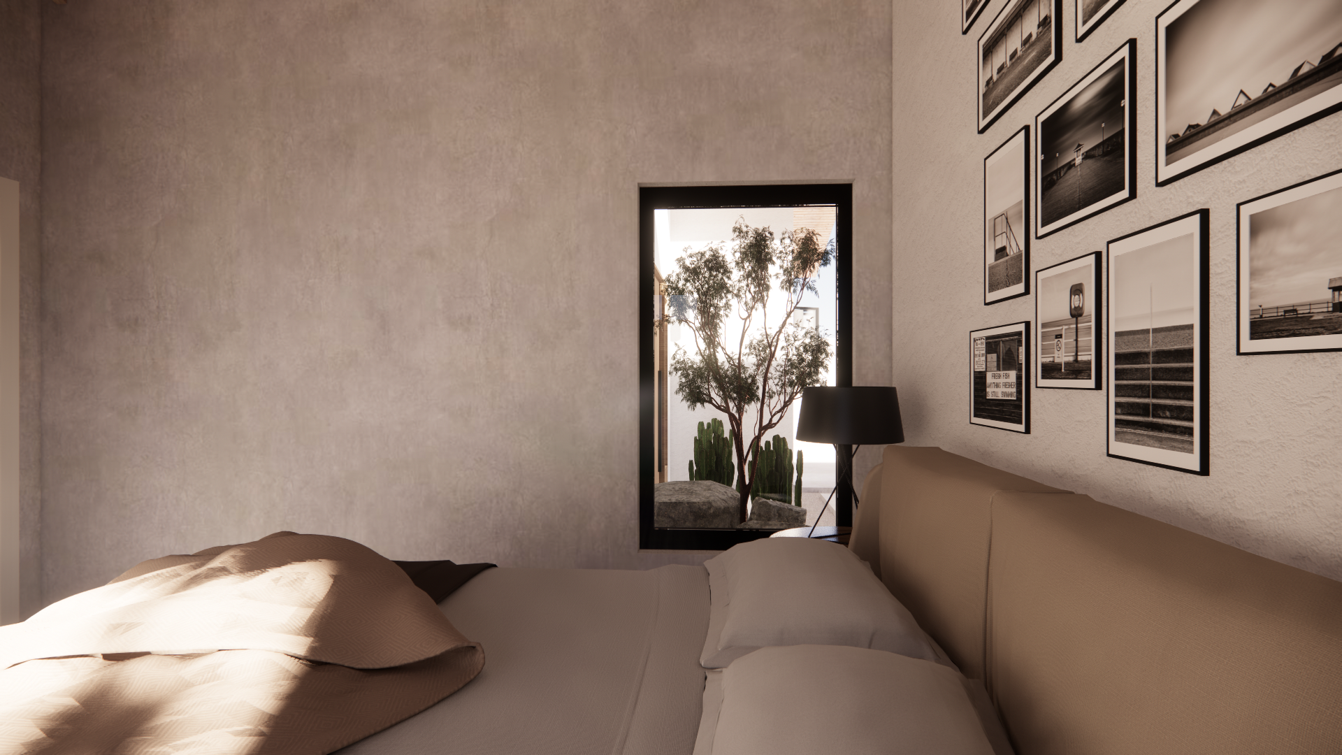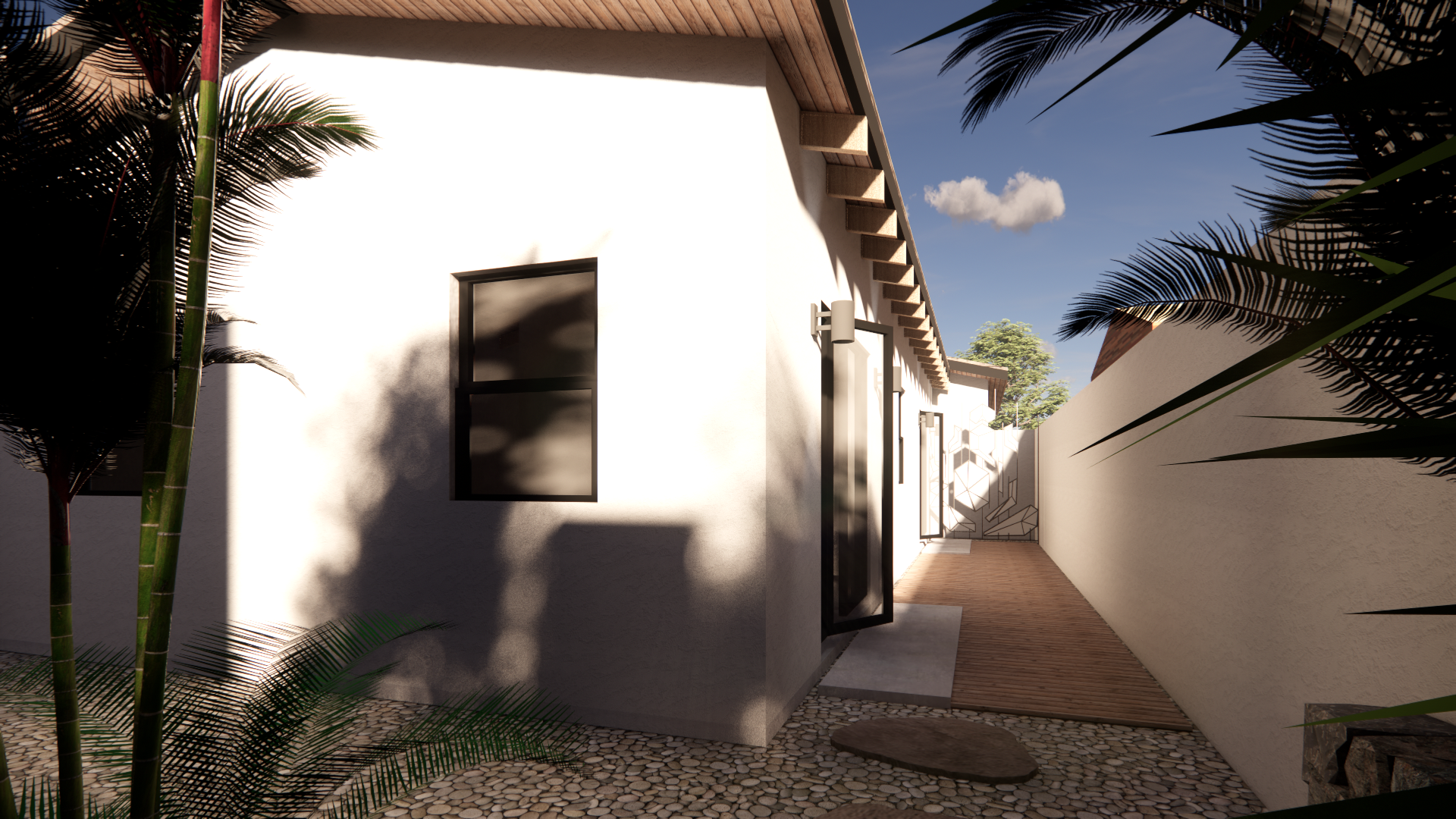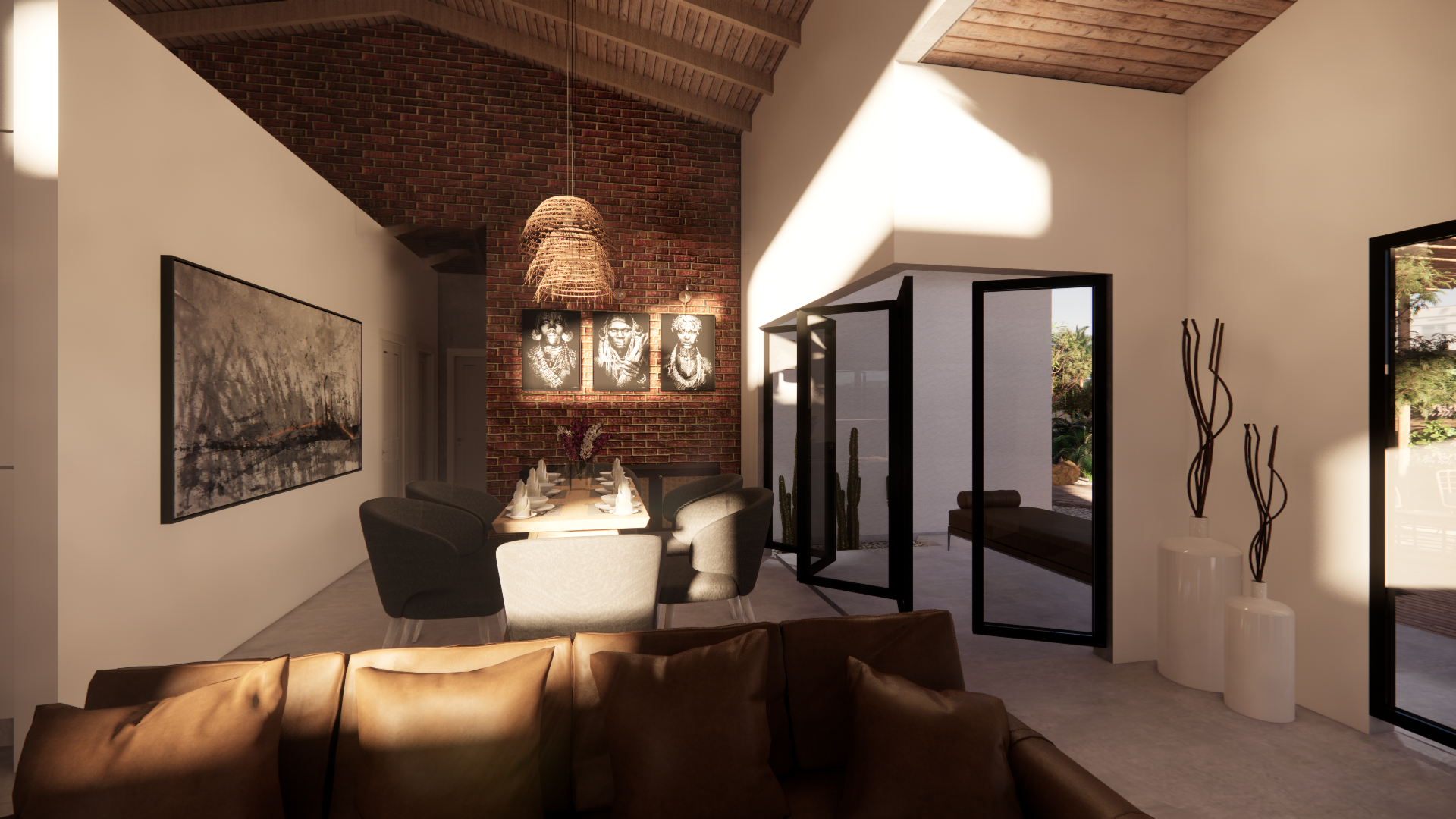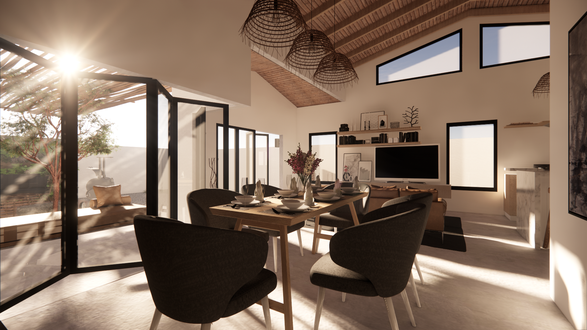 This accessory dwelling unit interplays between indoor and outdoor. The kitchen uses a pass thru window to communicate with the main property’s courtyard. The dining and family quietly opens up with a cozy backyard. The two bedrooms have a linear patio respectively. The aperatures + openings help unite and bind experiences cinematically.