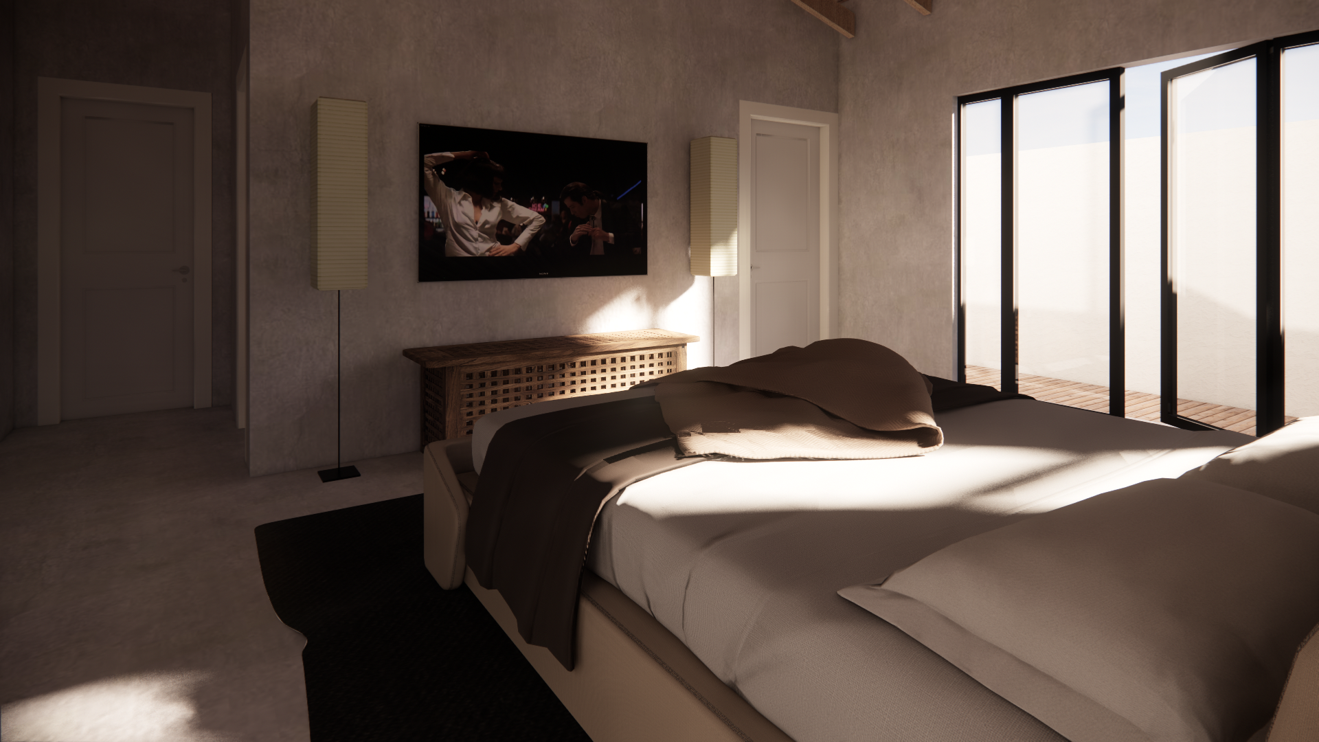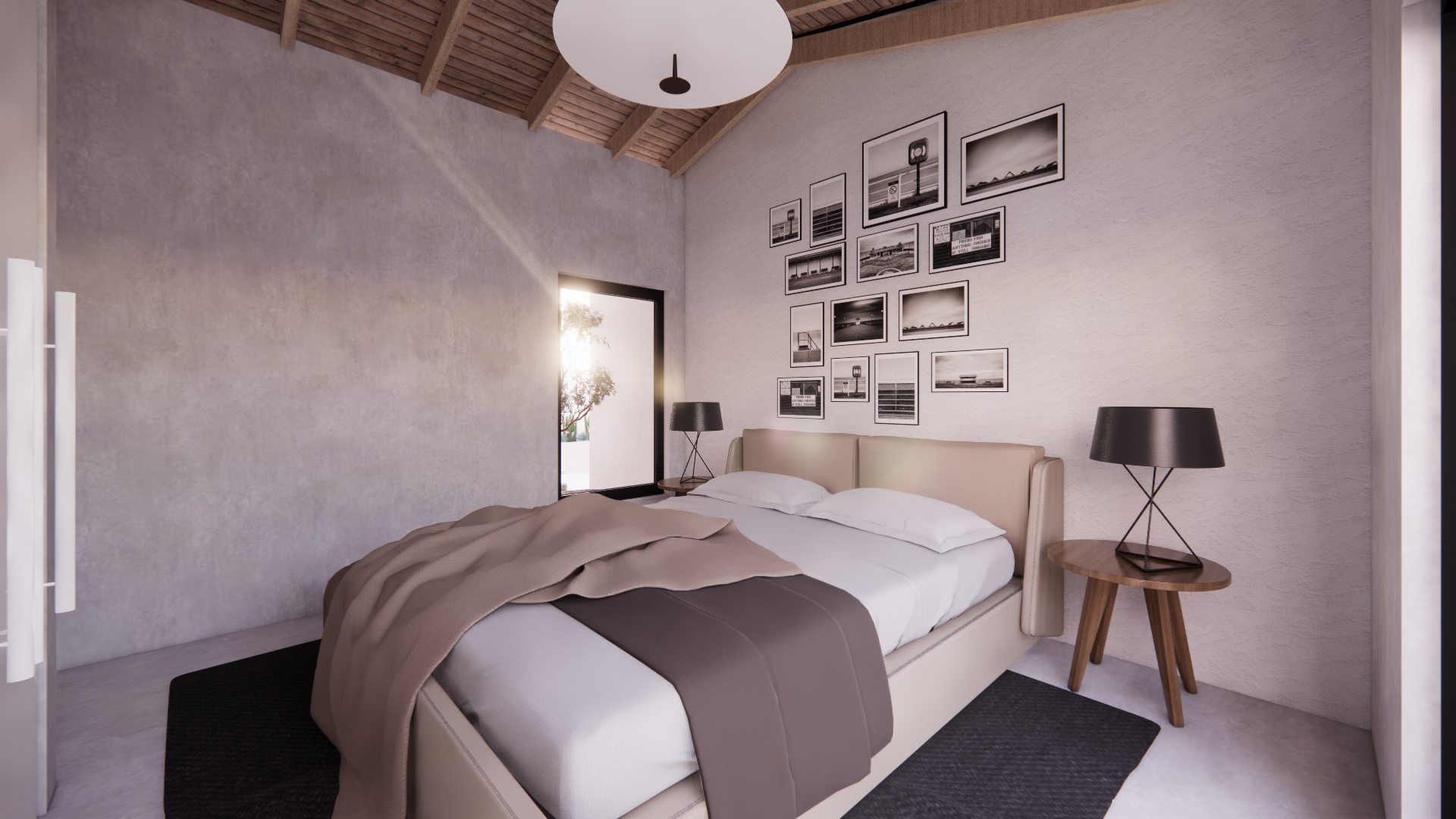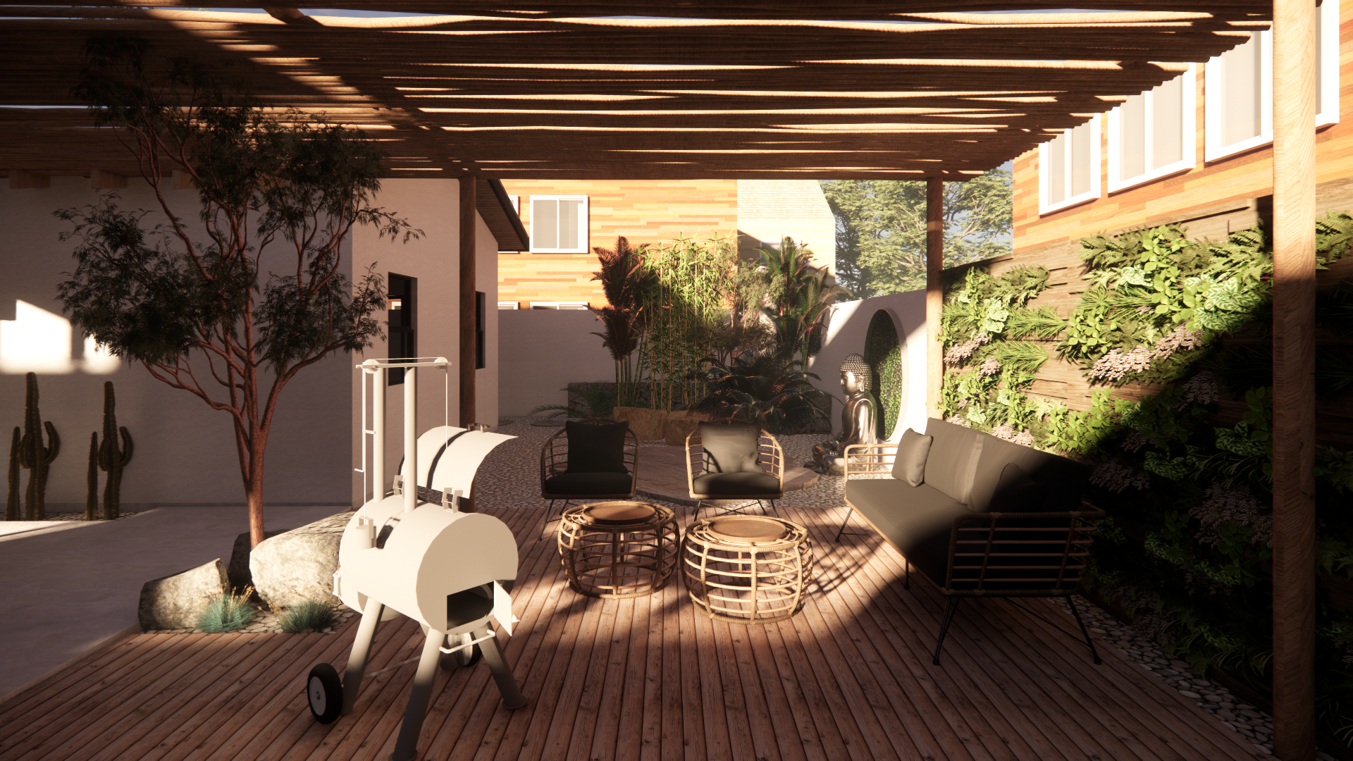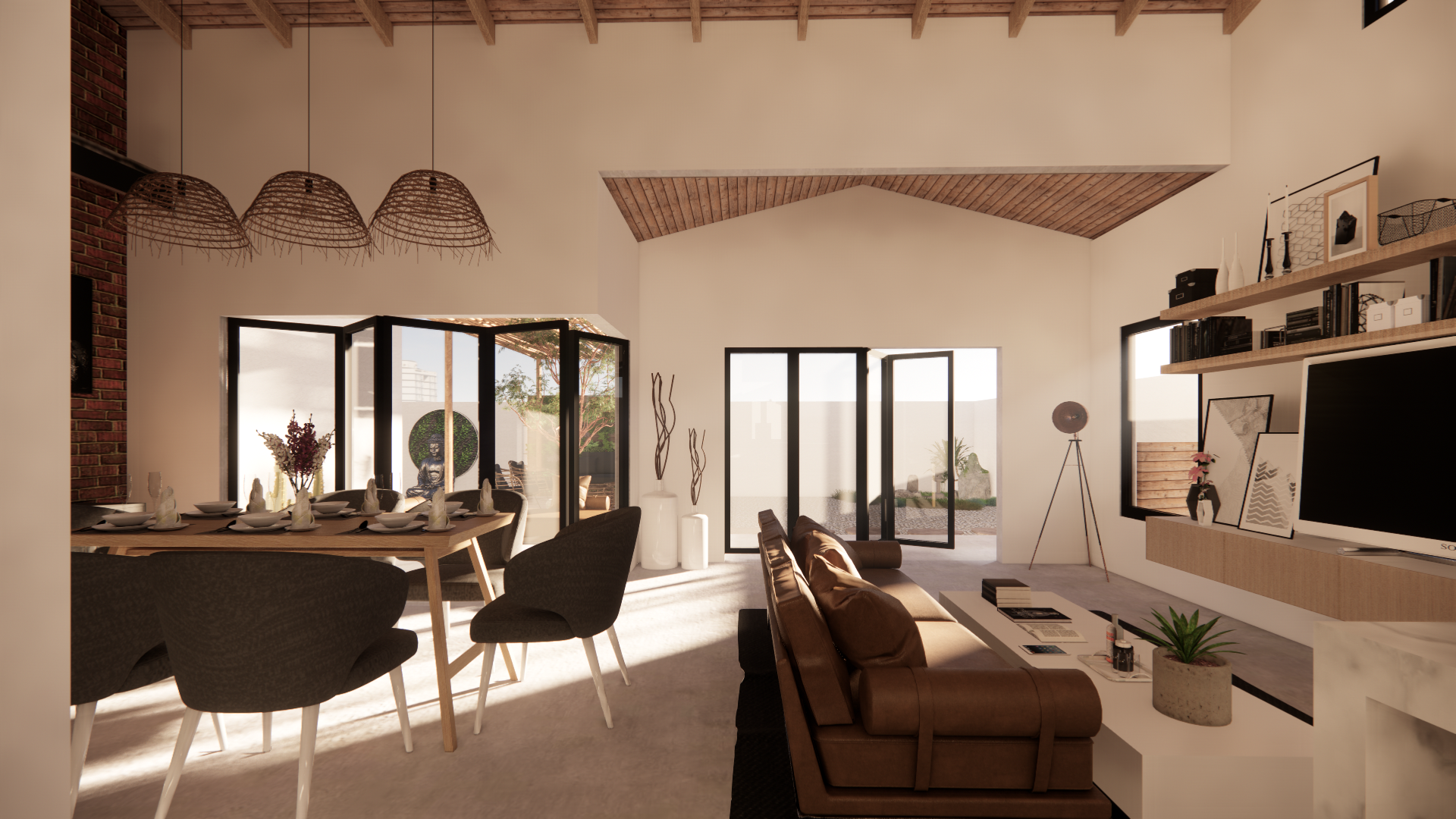 This accessory dwelling unit interplays between indoor and outdoor. The kitchen uses a pass thru window to communicate with the main property’s courtyard. The dining and family quietly opens up with a cozy backyard. The two bedrooms have a linear patio respectively. The aperatures + openings help unite and bind experiences cinematically.